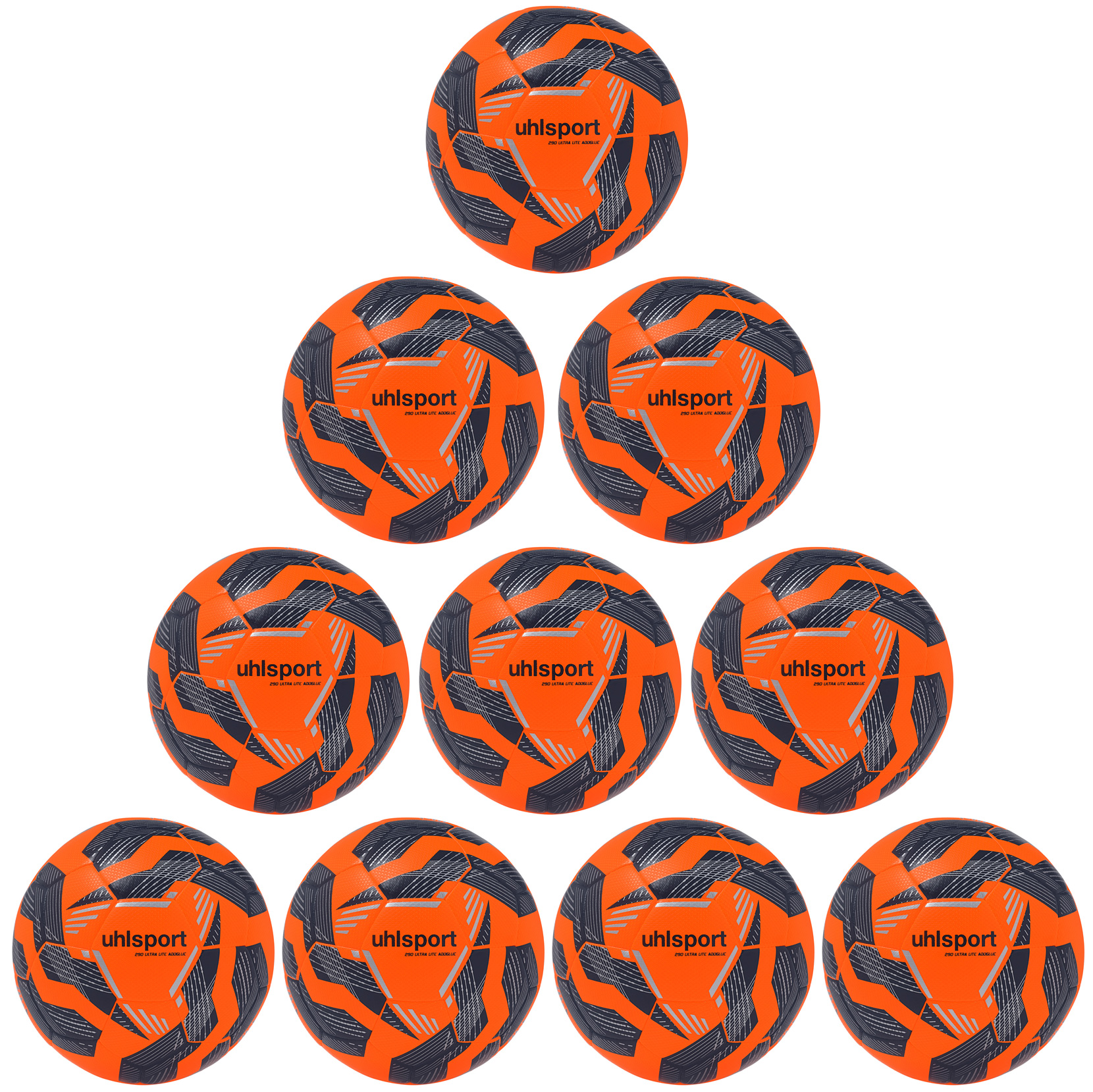 Startseite » Ballpakete » 10er Ballpaket / Ballset Uhlsport Fußball 290 Ultra Lite Addglue fluo orange/marine/silber Gr. 3, 4, 5
