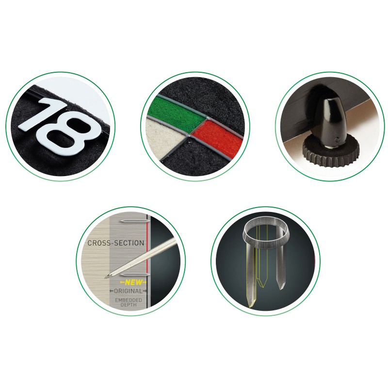 Der Verarbeitungsprozess des neuartigen ULTRA Sisals wurde weiter verfeinert, um eine noch bessere Qualität zu gewährleisten. Der Gesamteindruck wird durch den ULTRA Nummernring auf eine neue Ebene gehoben, der das Board ästhetisch aufwertet. Der neu entwickelte ULTRA Spider mit um 33% tiefer eingelassenen Drähten sowie das ULTRA Bull's Eye tragen dazu bei, Abpraller zu minimieren und die Trefferpunktzahl zu verbessern. Zusätzlich gewährleistet das Unilock Board System individuell einstellbare Halterungen, die jegliches Wackeln des Boards an der Wand verhindern.
